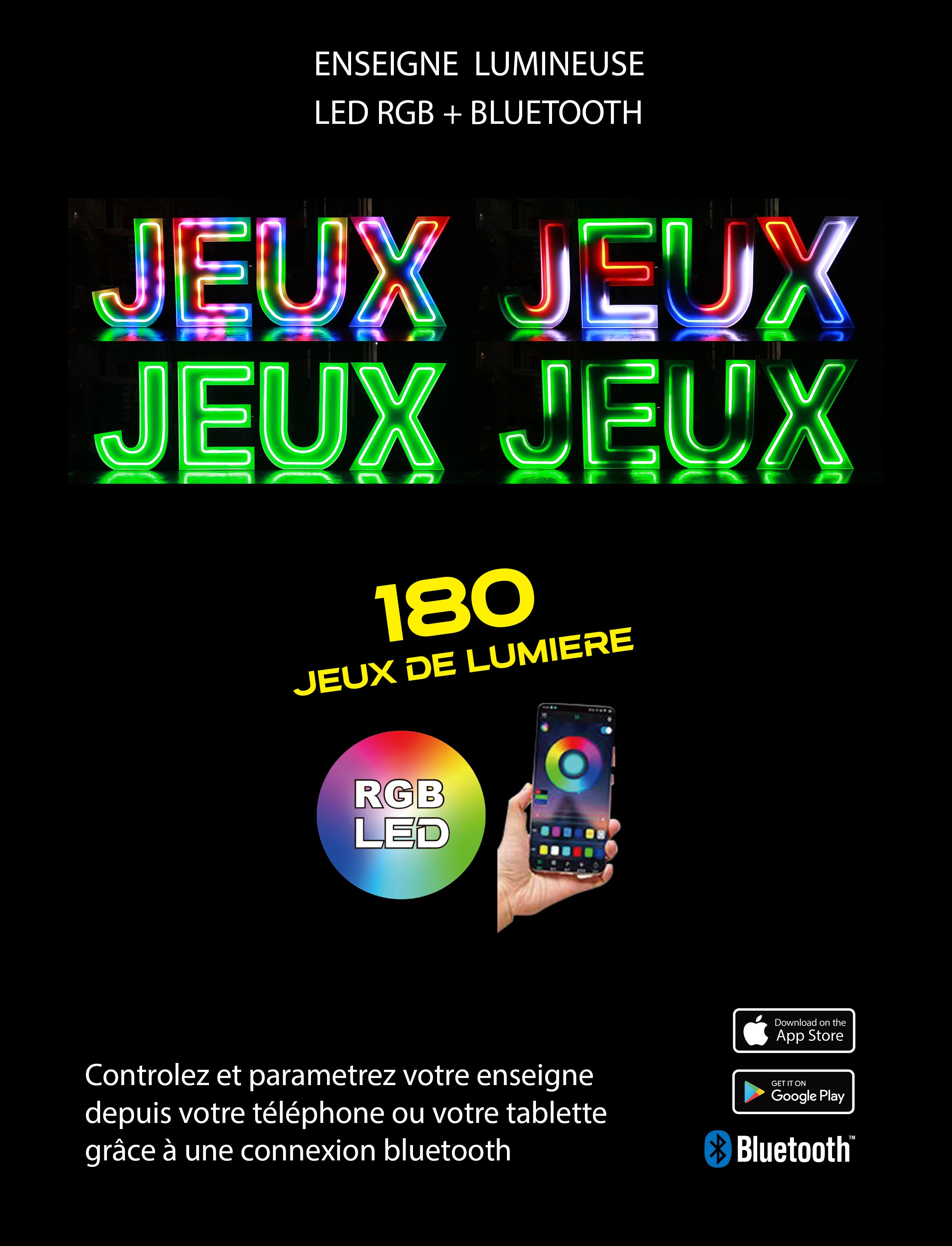 4 lettres lumineuses professionnelles XL RGB Bluetooth largeur 1,88 mètre (JEUX)