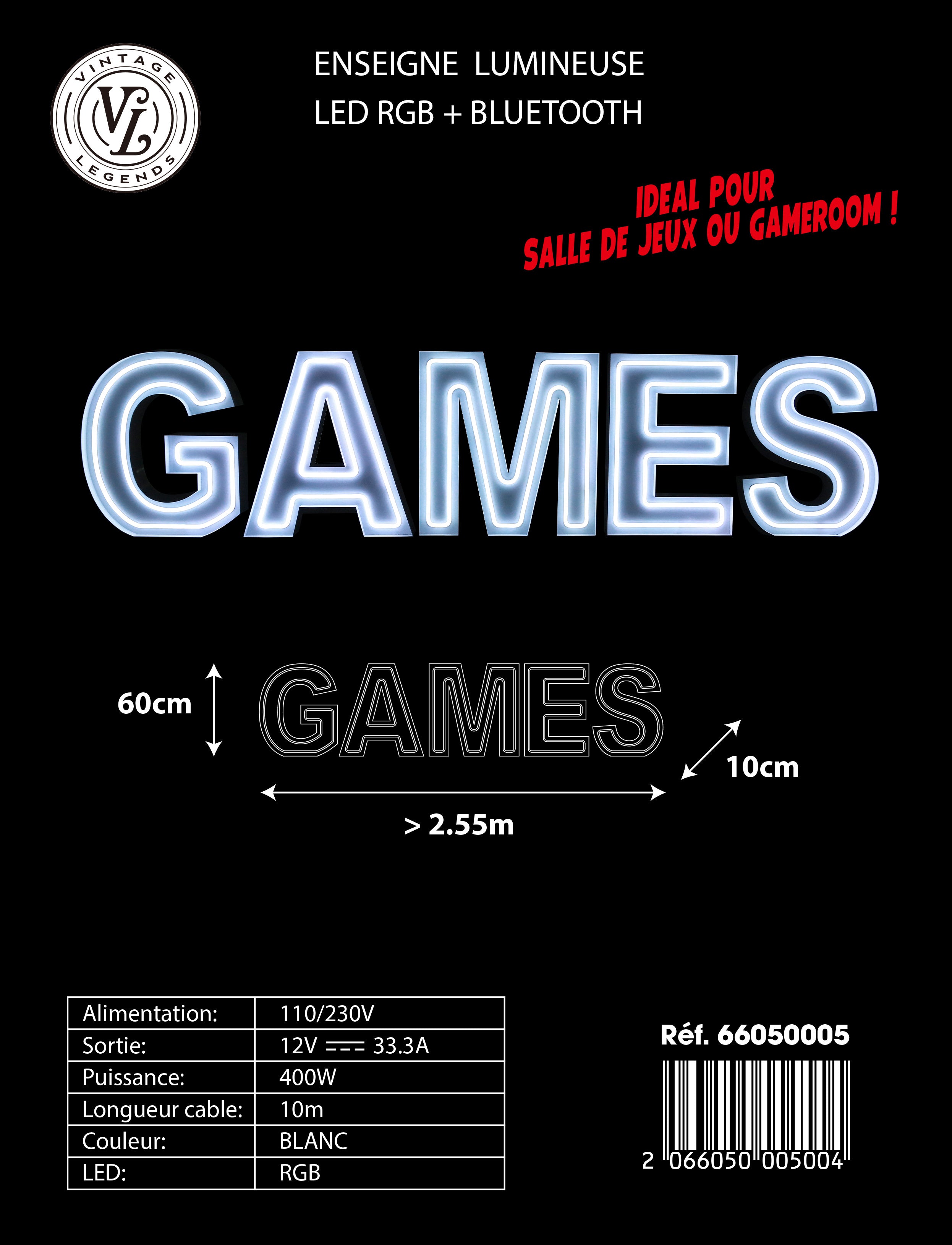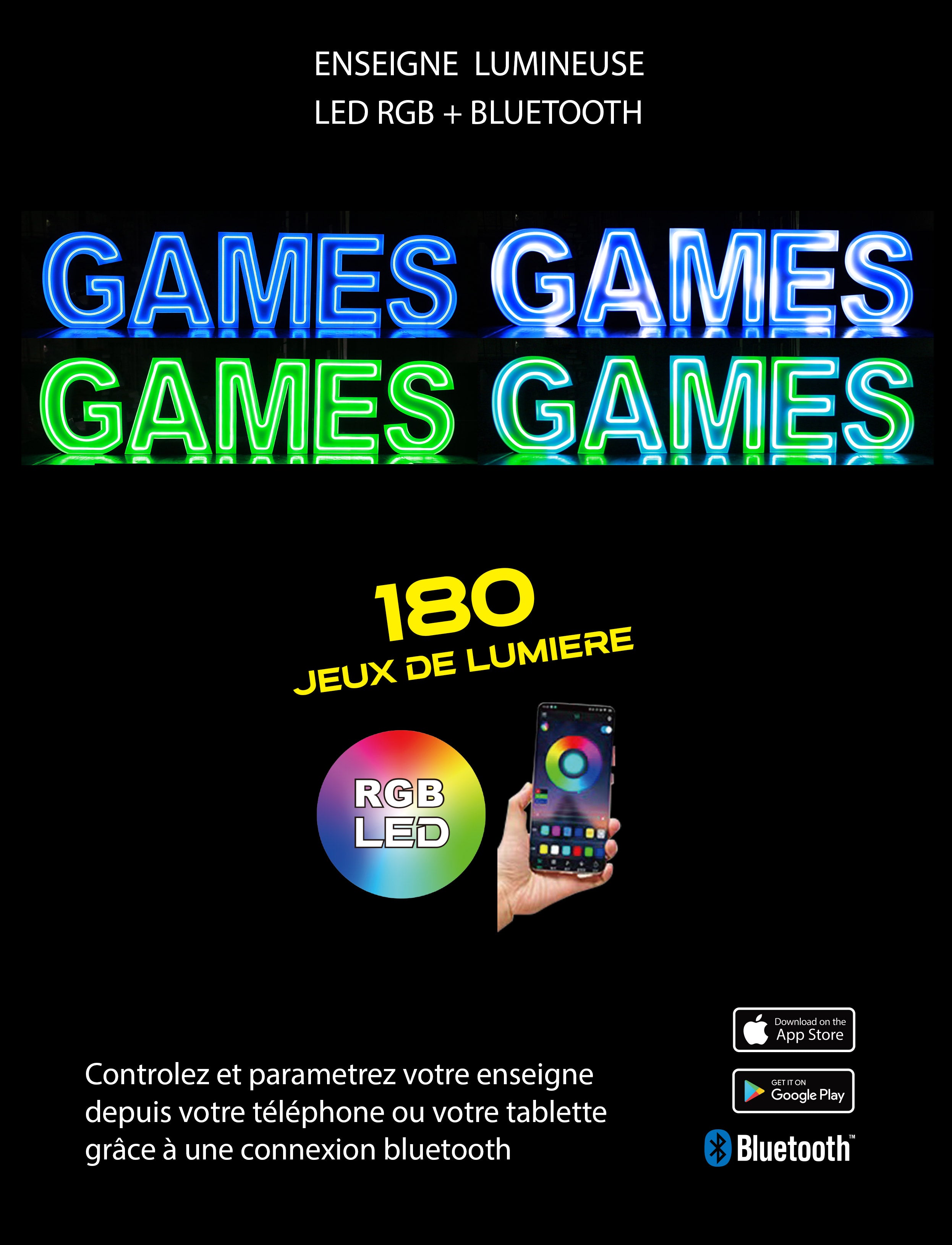 5 lettres lumineuses professionnelles XL RGB Bluetooth largeur 2,55 mètre (GAMES)