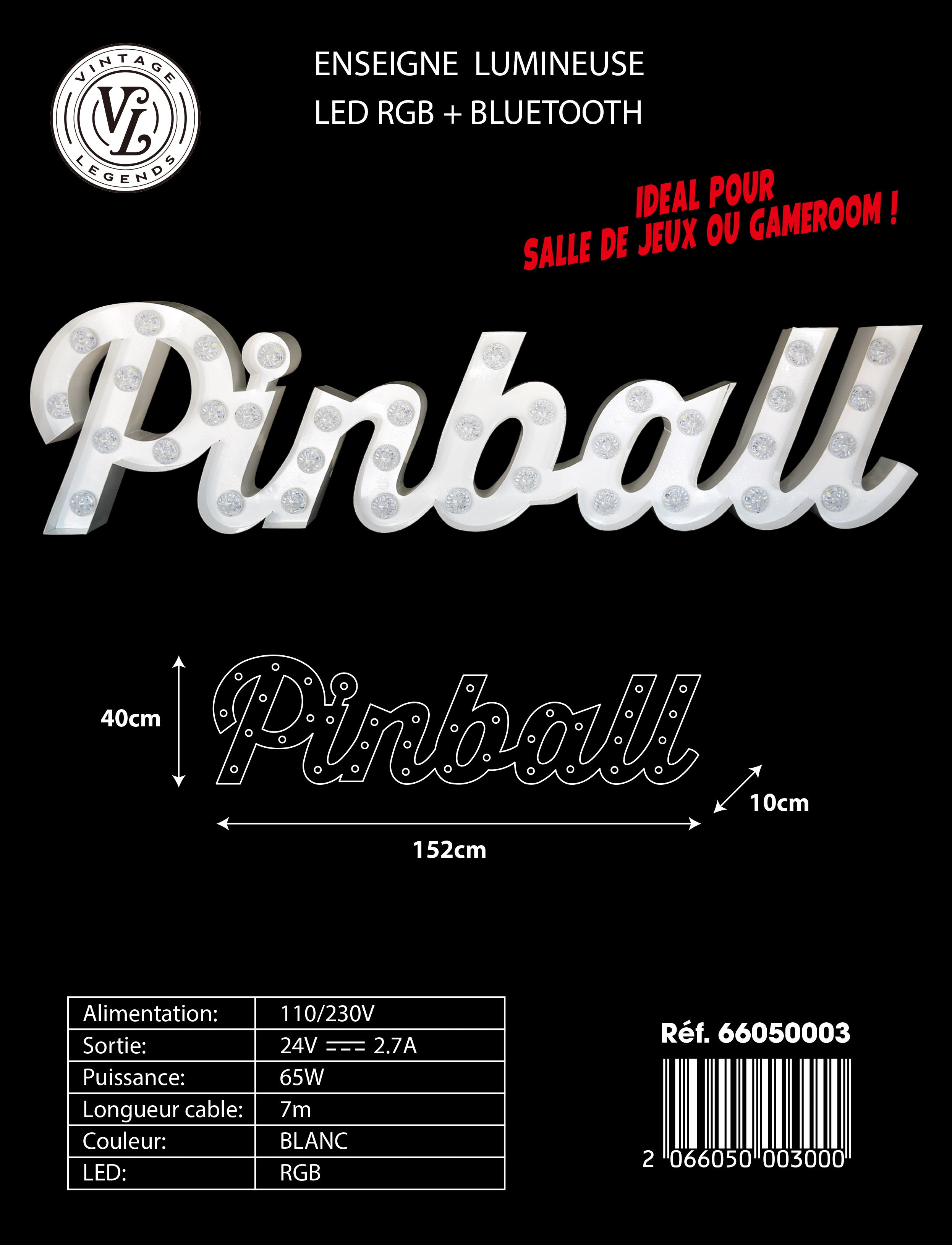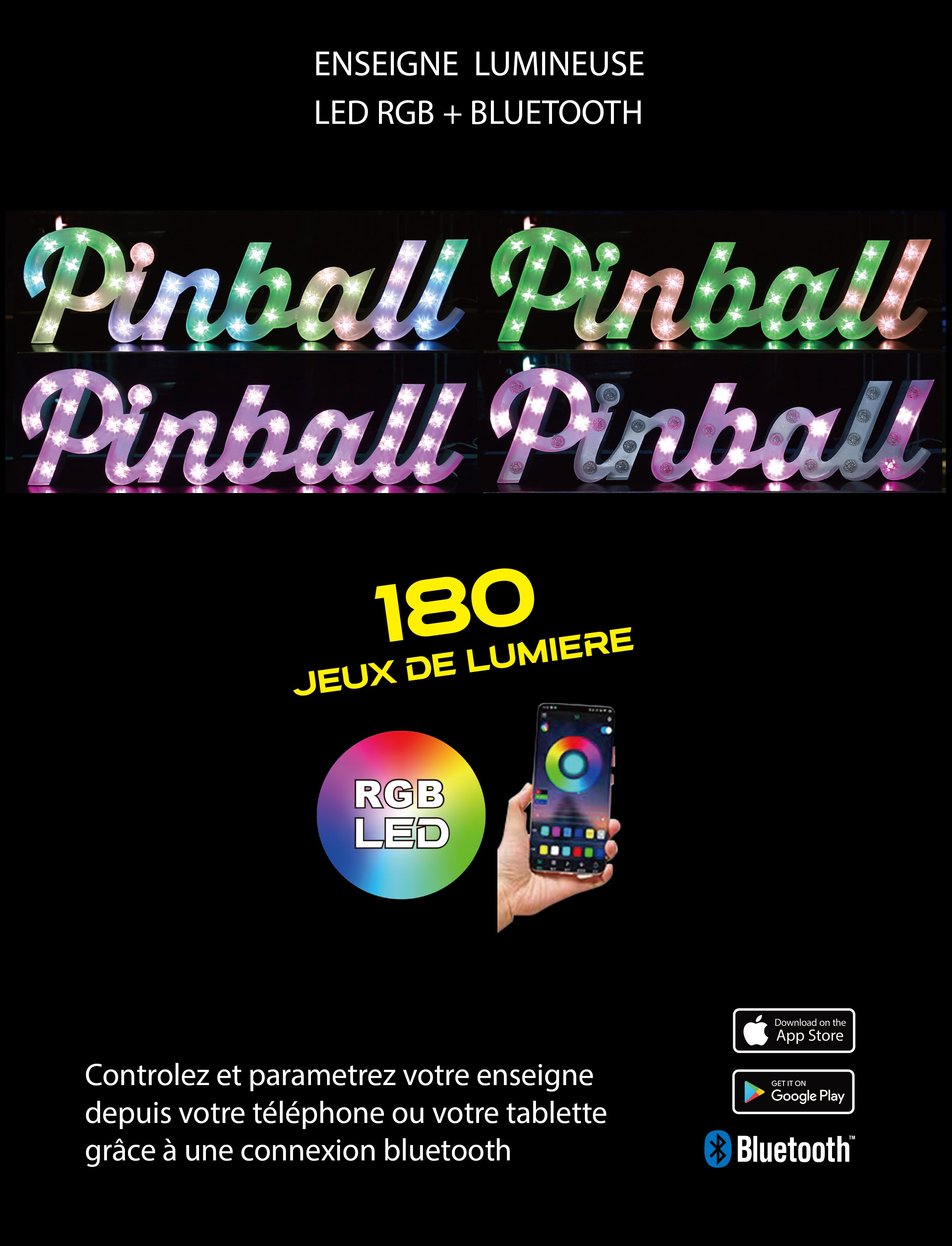 Enseigne lumineuse professionnelle RGB Bluetooth largeur 1,52 mètre (PINBALL)