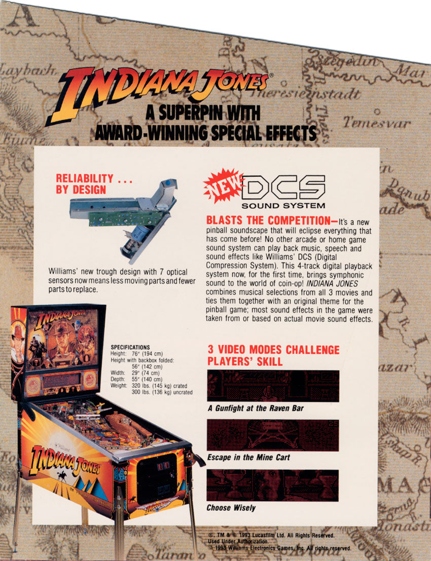 Inspiré de l’univers culte d’Indiana Jones, ce flipper est considéré comme l’un des modèles les plus complets jamais créés par Williams, avec un gameplay riche, des missions variées et des éléments mécaniques iconiques comme le Path of Adventure.