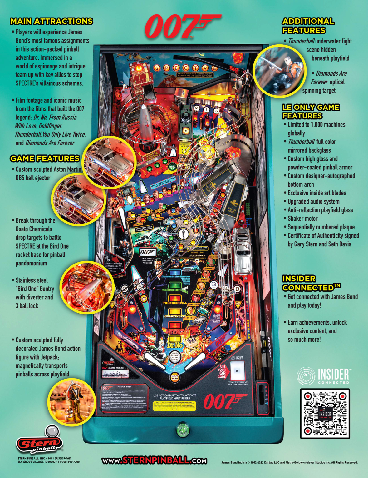 Le flipper propose un gameplay dynamique inspiré des films de la saga 007 avec des missions d’espionnage, des effets spectaculaires sur le plateau et une ambiance immersive fidèle à l’univers de James Bond.