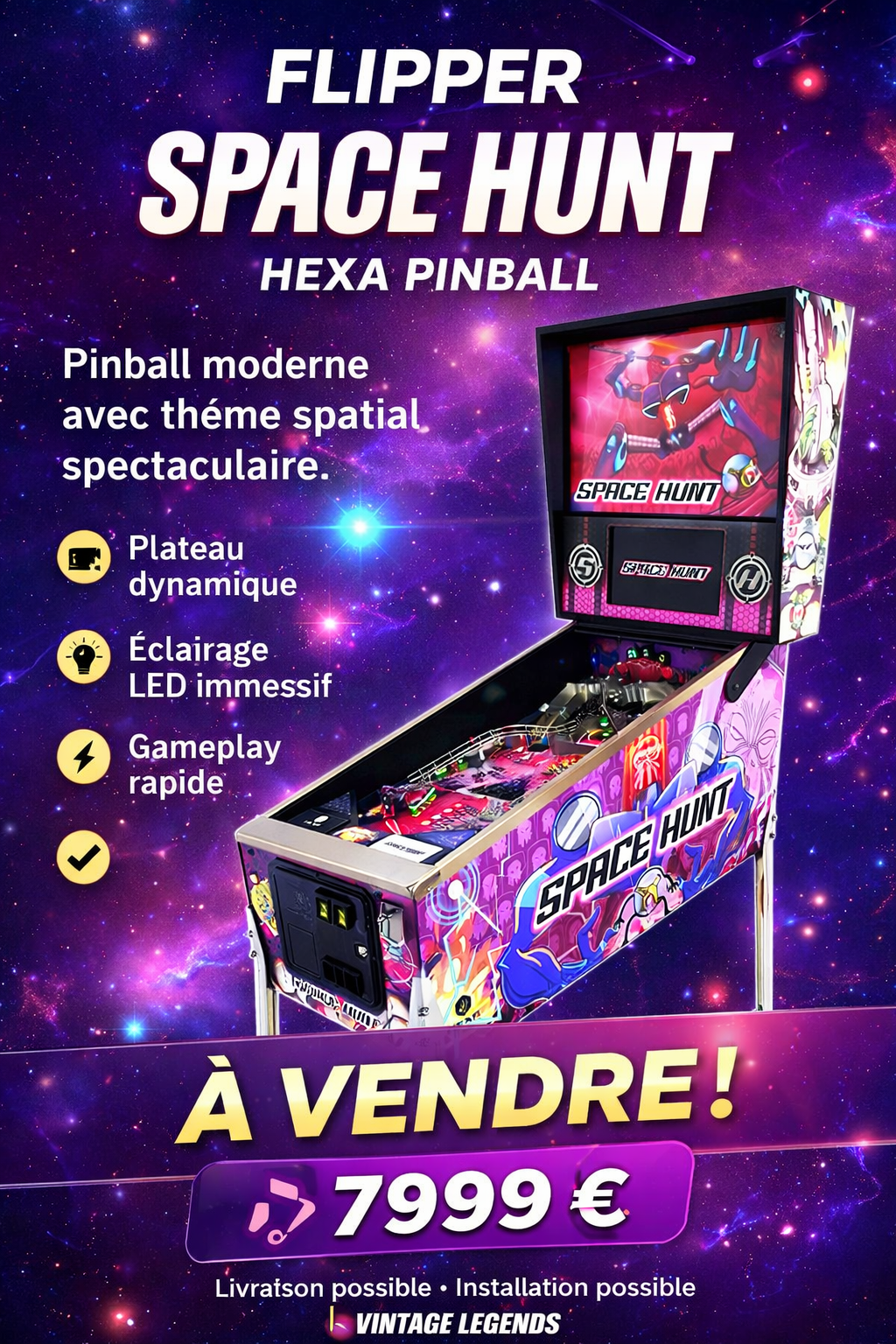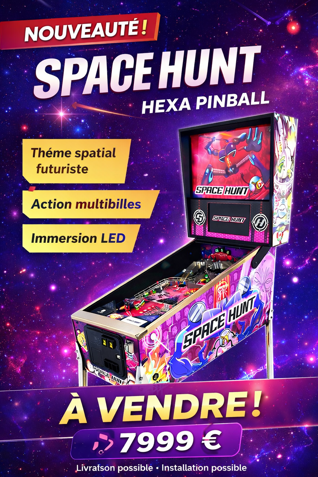 Découvrez ce flipper Space Hunt de Hexa Pinball, une machine moderne au thème spatial spectaculaire qui combine gameplay rapide, effets lumineux immersifs et design futuriste.