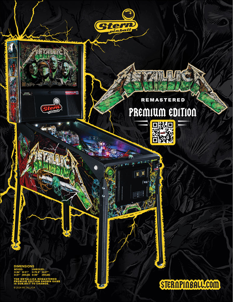 Le flipper Metallica Remastered célèbre l'une des plus grandes légendes du rock avec une mise à jour moderne qui intègre des extraits de concerts en haute définition et un gameplay amélioré. Propulsé par le système électronique Spike 2 de Stern, ce modèle Premium vous plonge dans l’univers de Metallica avec 22 chansons, soit 8 de plus que la version originale, et des règles de jeu enrichies pour une expérience toujours plus intense. Le design du flipper a été revisité avec un système d'éclairage Expression Light (kit en supplément sur la version Premium) et deux nouveaux visuels de caisse signés par l'artiste Rhys Cooper. Vous retrouverez le flow légendaire du plateau Metallica, rehaussé par des améliorations mécaniques, des jouets de jeu mis à jour, ainsi que des effets lumineux UV saisissants.