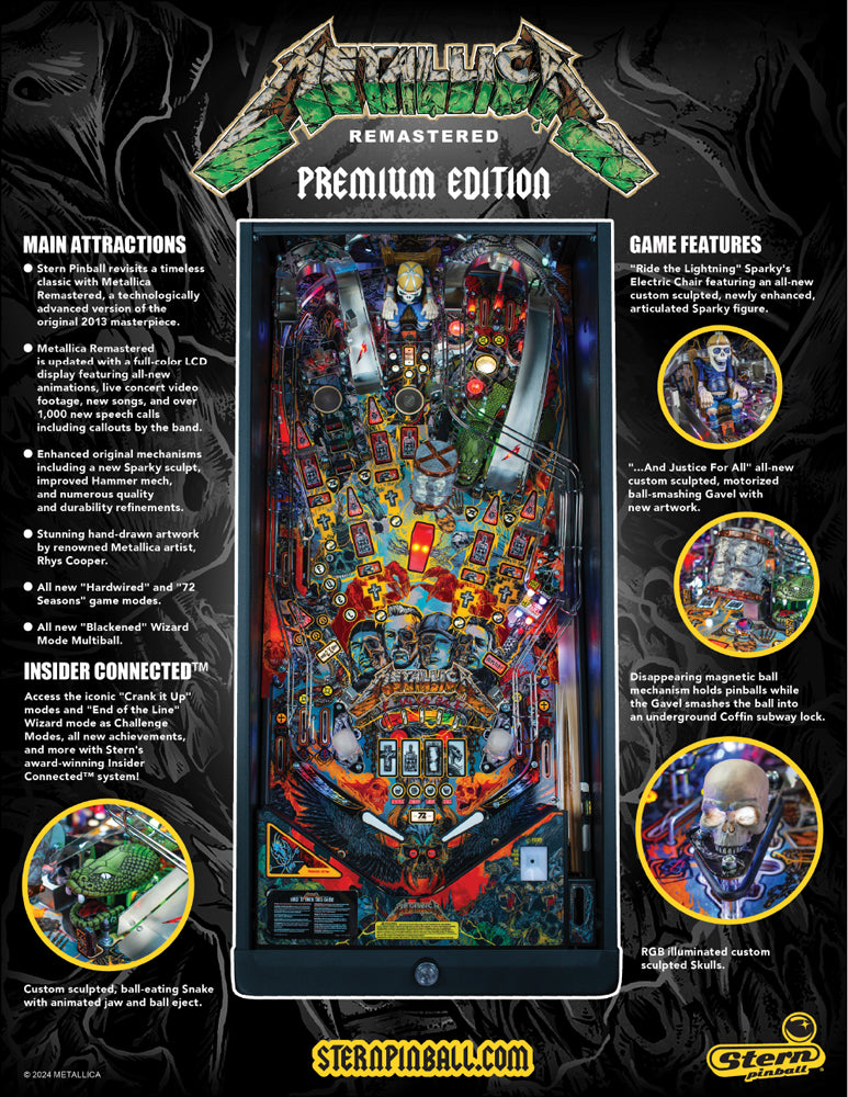 Comme pour tous les flippers modernes de Stern, la version Premium Metallica Remastered est équipée de la plateforme Insider Connected™. Grâce à cette technologie, les joueurs peuvent suivre leur progression, débloquer des succès, et participer à des quêtes en ligne. Insider Connected™ permet également de recevoir des mises à jour régulières de Stern pour prolonger le plaisir et garantir une expérience toujours renouvelée.