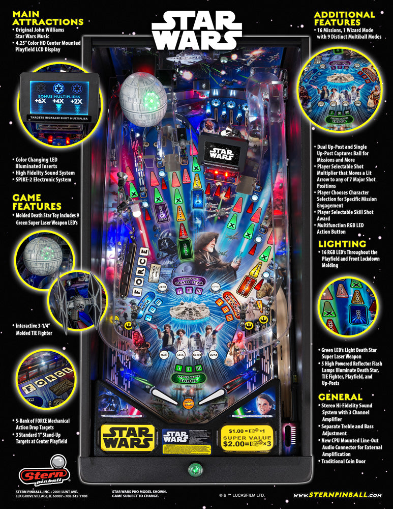 Prenez plaisir à rejoindre les héros Luke Skywalker, Han Solo, Leia Organa et R2-D2 dans une aventure interactive pleine de rebondissements avec ce flipper imaginé par Stern Pinball.